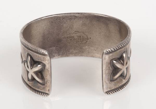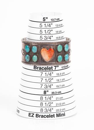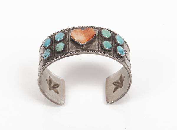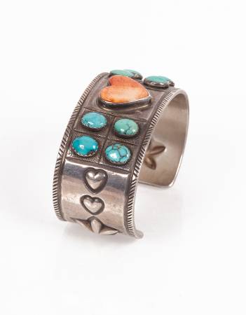 A fantastic cuff bracelet by Gringo Hill Silversmiths with beautiful heart shaped coral enamel centerpiece and 4 oval shaped turquoise enamel accents. 2 embossed hearts hearts and one larger star on both sides round out this incredible work of art.