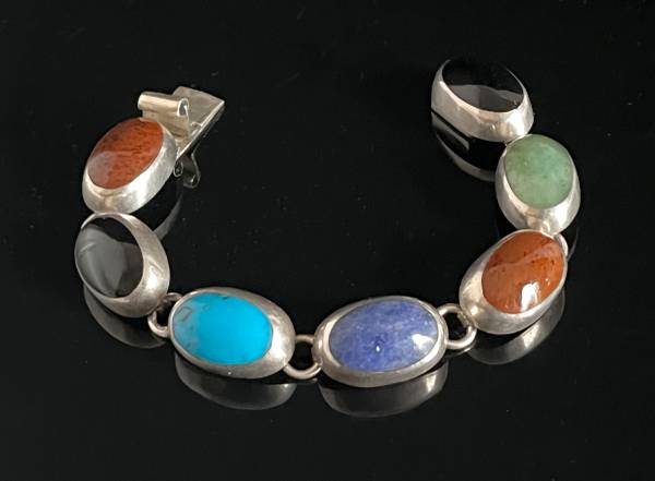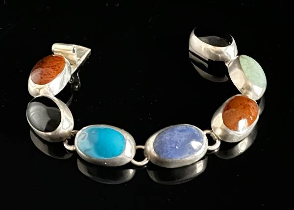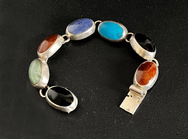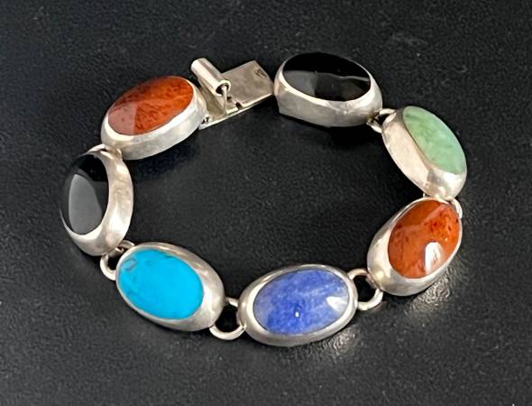 Beautiful 7 oval gemstones set in sterling silver bezel mount. Has a Taxco stamp, TC-119, plus 925 MEXICO stamped on the clasp.