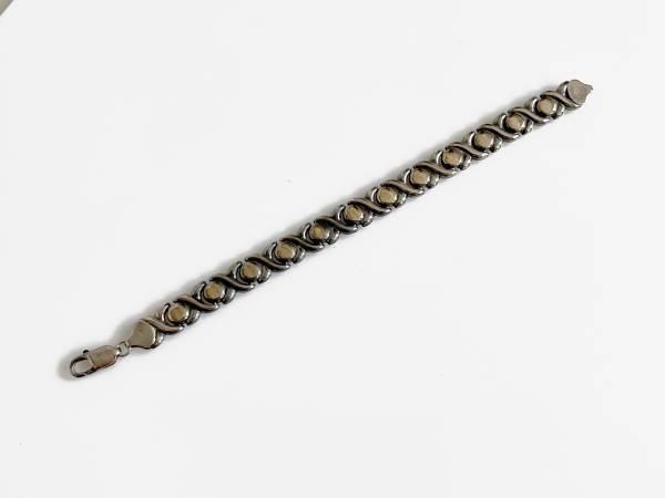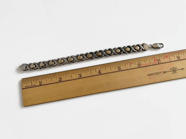 Fine looking sterling silver chain bracelet from Italy with wavy criss cross patters surrounding sterling gold tone accents. Measures 7 1/2" total length, 3/8" wide and weighs 14.8 grams. Should fit wrists up to a size 6 3/4". Marked ITALY 925. Features strong, good working lobster clasp.
