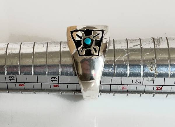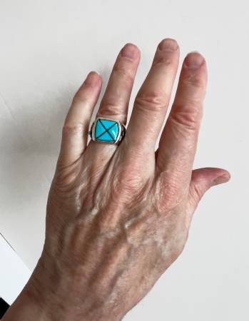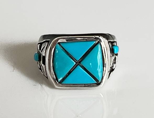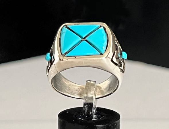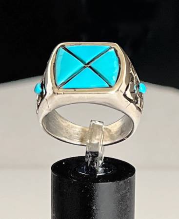 Native American Sterling Silver Genuine Kingman Turquoise Overlay Ring. Size 10. Measures 1/2" across the top with the turquoise cut and set in diagonals giving it the look of an "X". Sides are done in overlay with a small turquoise stone. Great weight at 17 grams. Beauty!