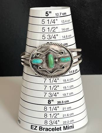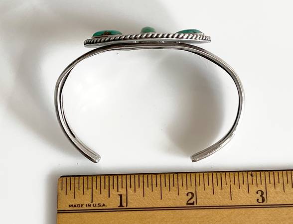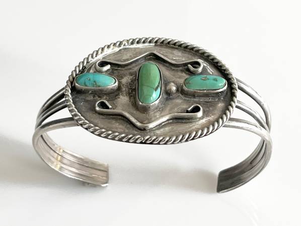 Very unique, vintage Navajo sterling silver cuff bracelet with 3 oval green/blue turquoise gemstones. 3 band cuff with oval setting featuring outer twisted rope border with wavy lines and one bead. Possible missing one little bead. Fits wrists up to 7", with some flexibility. Unmarked, possible old pawn. Tested as sterling silver. Top section is 1 15/16" long x 1 1/2" wide with a gap that is 1 1/4". Total weight is 30 grams