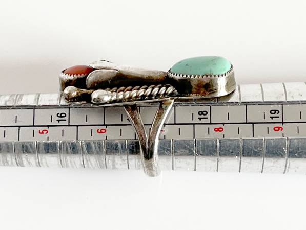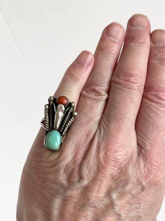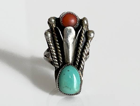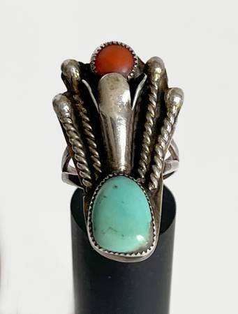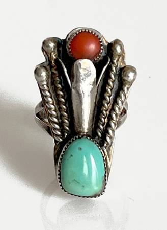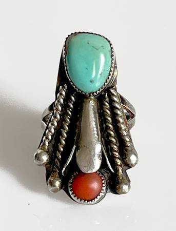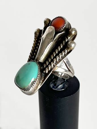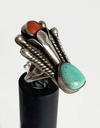 Gorgeous green blue turquoise and red coral gemstones sawtooth bezel set in sterling silver. Beautiful, well balanced hand made design attributed to the Navajo silversmiths. Size 7 and weighs a solid 9.8 grams. The top measures 1 3/8" x 7/8". Also features a squash blossom, twisted rope with bead tops and a red coral gemstone coming out of the top of a blossom. Excellent work.
