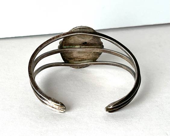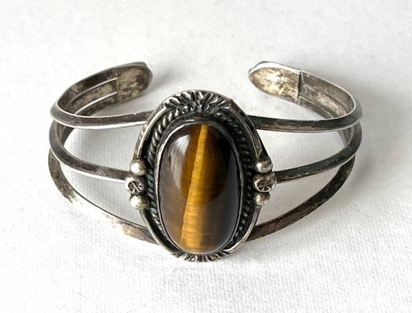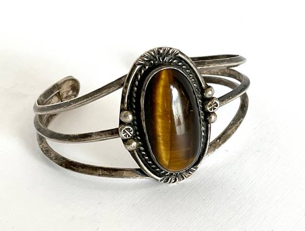 Excellent Navajo Native American sterling silver cuff bracelet with 1 large oval tiger eye cabochon with a bezel setting surrounded by a fine twisted rope border and an outer border with carving and beadwork. The band consists of 3 separate bands blended together at the tips.