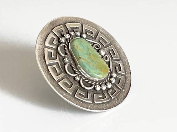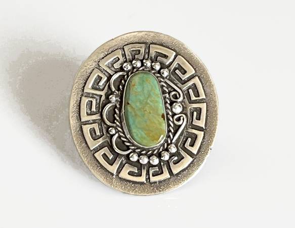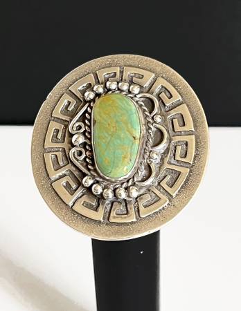 Gorgeous Lee Brown Navajo large and heavy sterling silver ring with a green blue turquoise stone. Size 8. Total weight is an amazing 42 grams. Features a geometric pattern surrounded by a plain border and overlay in the middle with a beautiful bezel set oval shaped stone. What an eye-catcher. Marked STERLING LB on the back and also features a triple shank for comfort and balance. Top measures 2" x 1 3/4" and the stone is 7/8" x 1/2".