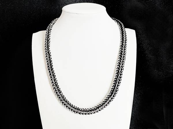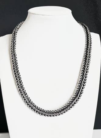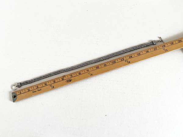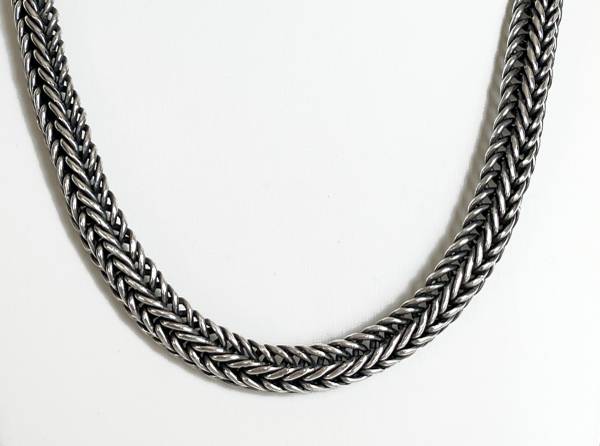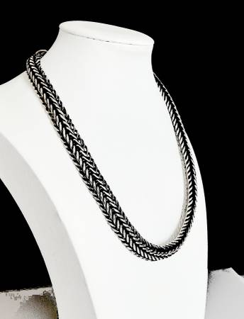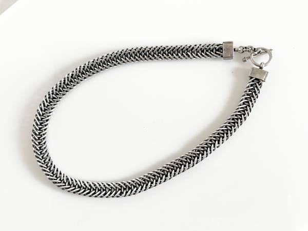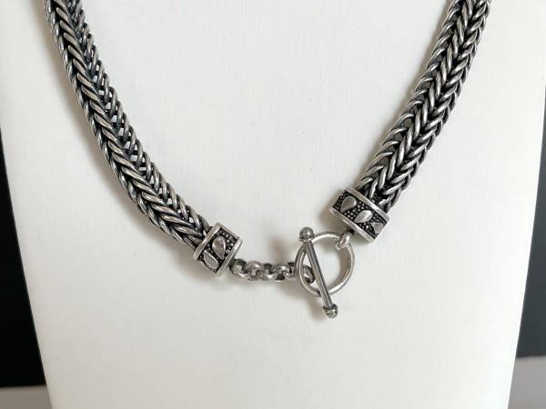 Great looking stylish vintage sterling silver thick woven chain link necklace that is 18" long and 7/16" wide. Tested as sterling silver. Total weight is 111 grams and features a large toggle clasp. A clean powerful look to enhance your wardrobe and jewelry collection.