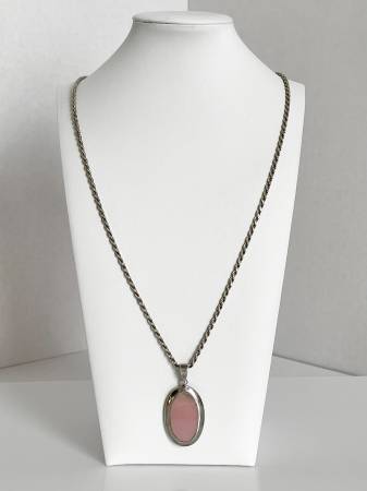Really great looking oval shaped pink mother of pearl sterling silver pendant on an Italian 925 sterling silver twisted rope chain necklace. Measures 28" in total length and weighs 26.9 grams. The stone is 1 1/4" x 5/8". The pendant is 2" x 1". The necklace is marked ITALY 925 at the ends of the chain. The pendant is marked 925 on the back.