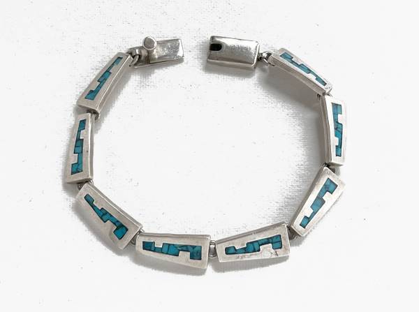Great looking 8 section TAXCO Mexico sterling silver 8 1/4" total length bracelet with turquoise chips. Total weight is 30.3 grams. Great working clasp. Marked MEXICO TV-98 925