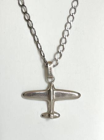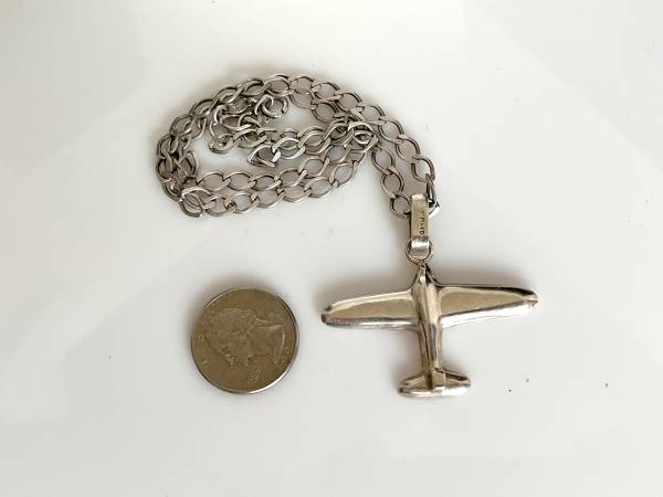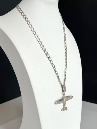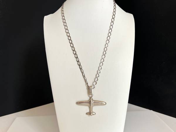 Solid sterling silver airplane pendant signed TM 10 (TAXCO) on a 17 1/2" length sterling silver oval chain link necklace with a round spring clasp. Necklace is marked ITALY 925. Pendant measures 1 7/8" x 7/8" total and the total weight is 17.7 grams.