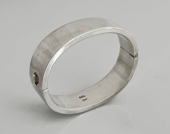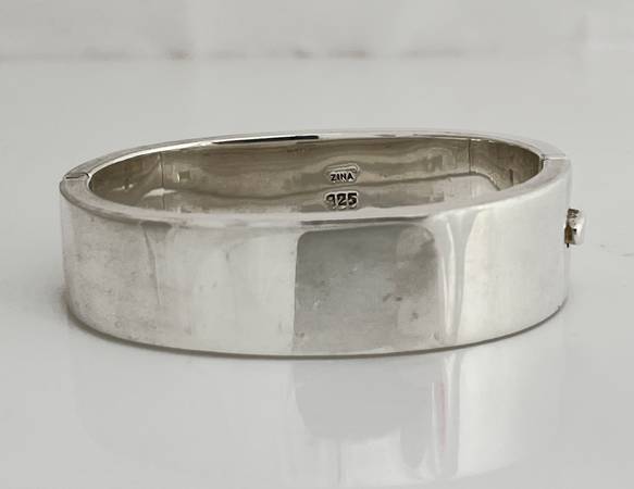 Solid vintage ZINA sterling silver hinge bangle bracelet, size up to 6 1/2", possibly 6 3/4". I'm a 7" and can get it on but perhaps a touch tight. Weighs 48.8 grams and the inside diameter is 2 1/4" and width is 5/8". Features a high polish, modernist design with strong hinge and push lock clasp. Signed ZINA 925.
