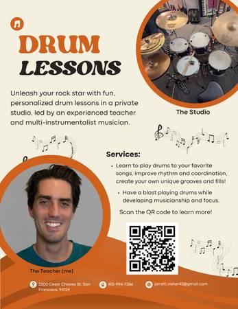 My name is Jarrett, I’m a multi-instrumentalist musician and educator with over 20 years of experience. I am offering private drum lessons to youth and adults, with all skill levels in a studio location in San Francisco.
