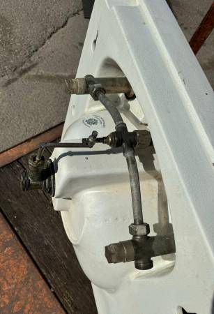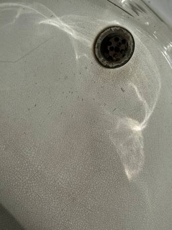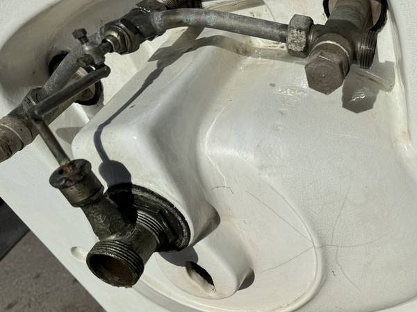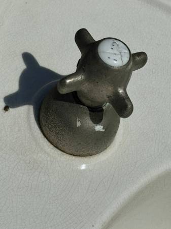 Circa 1885 – 1915. Vintage Vitreous China with crazing all over. Underside shows a crack, see photos, I don’t believe that it will affect the functionality of the sink. Original nickel over brass hardware. Most of the nickel has worn off.