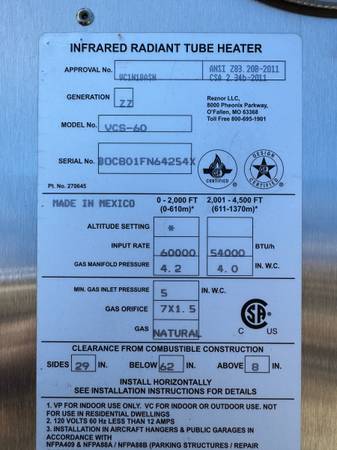 New in the original box. Reznor VPS60 Gas-Fired Radiant Indoor Heater - Burner Box Only.