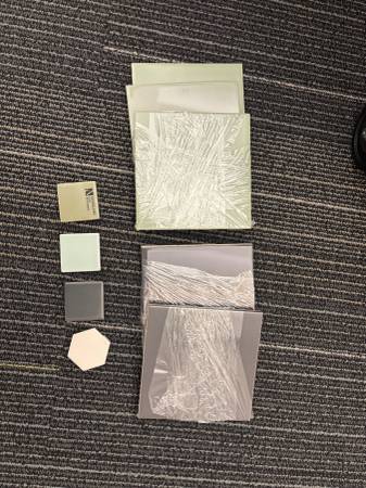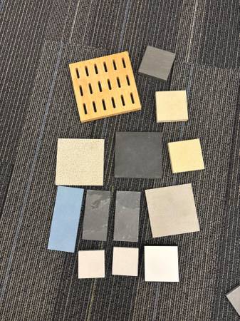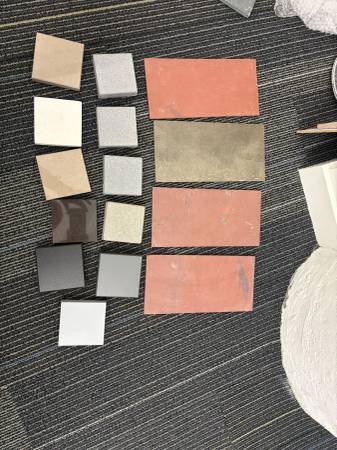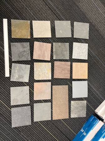 Assortment of tiles and porcelain and slate (different colors/sizes), laminate flooring strips (not pictured), 12x12 glass samples Please take ALL or MOST Email to coordinate pick up!