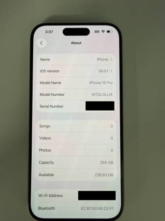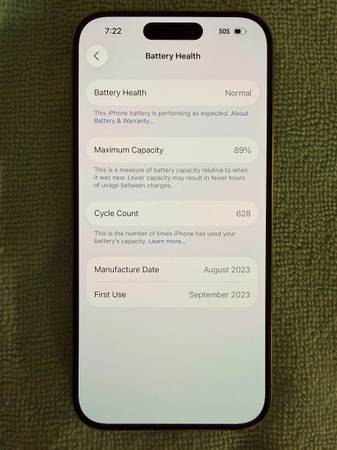 iPhone 15 pro (not pro max) 256 gigabyte storage in natural titanium color. It's unlocked, so it can be used with any service provider. Battery health is 89% Phone was in a case the entire time I...