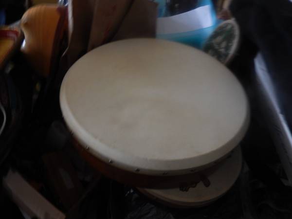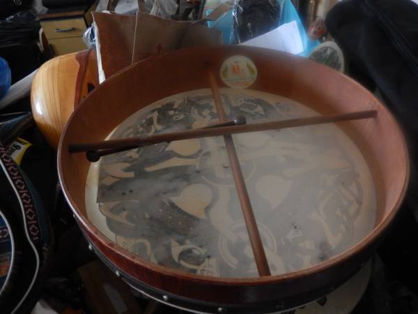 Well loved old Bodhran drums, depicting the solution for a happy life!!! Many to choose from with Tippers.