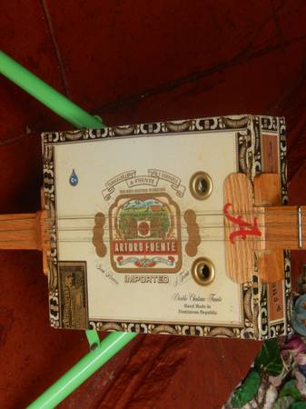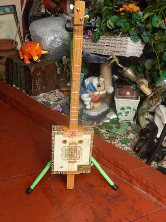 Light weight, entertaining, talk of the party, ingenious, cigar box 3 string guitar. Tuned to open G. G D G.
