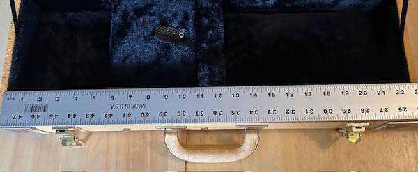 This is a Beautiful Faux Ostrich Skin hardshell case for a soprano ukulele...it will accommodate an instrument that measures 22" in length and about 3 1/2 inches deep. This case came to us several years ago when we had an arrangement with KALA to sell factory-second ukes that had cosmetic blemishes or needed minor repairs.