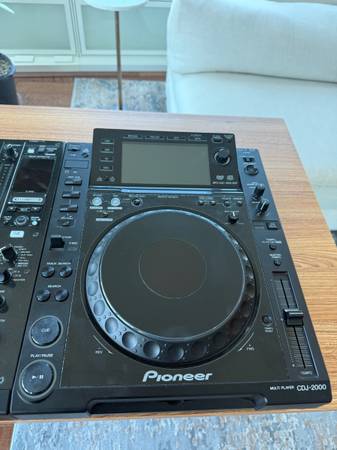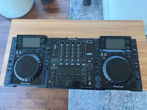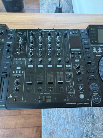 Complete professional DJ setup in like-new condition. Two CDJ-2000 players and DJM-900 Nexus mixer. All three pieces come with heavy-duty flight cases for protection and transport.