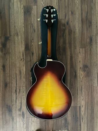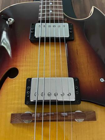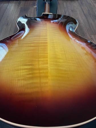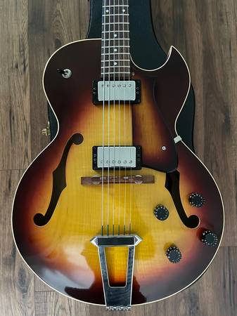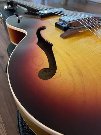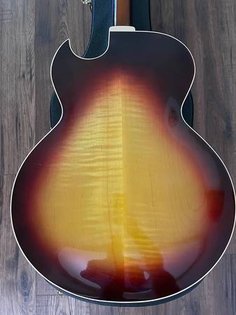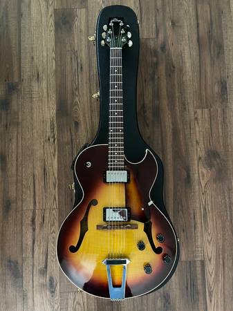 Really clean and beautiful sounding The Heritage H-575 from 1996. This is basically a Gibson ES-175 but instead of laminate, it is made completely from solid maple. Because of that, If feels really solid when you play it. It also projects really well acoustically even with it being about an inch thinner than a Gibson ES-175. The pickups are Schaller Humbuckers which many say retain the acoustic sound better than what Heritage puts in the H-575 now. Includes the original hardshell case. Email for more details. No trades!