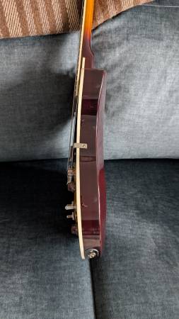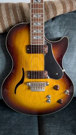 Vox Virage Sunburst w/Original DiMarzio Pickups, HSC and Tags. Made in Japan. Semi Hollow Mahogany Body/Ash top with Soundpost "3D contoured bodydesign" rather than a solid center block making it a wonderfully light guitar similar in weight to an ES-339. Two DiMarzio USA Made Three-90 Pickups capable of delivering Humbucker, P-90 or Single Coil Tones via two 3 way switches one for each pickup. Super fast carved cutaway body allowing for total fingerboard access (see photos) These are incredibly well thought out guitars that carried a hefty price when they premiered in 2008. Made in Japan with the DiMarzio Pickups for the first year only before switching to Korea with proprietary pickups. Excellent condition. Plastic still on the pickguard. OHSC is immaculate. These are fantastic guitars now long discontinued.