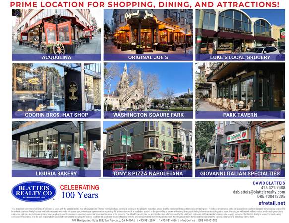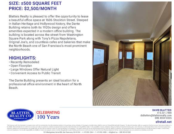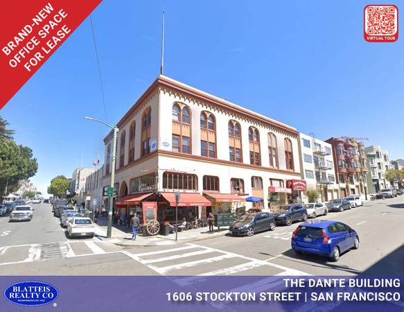 Blatteis Realty is pleased to offer the opportunity to lease a beautiful office space at 1606 Stockton Street. Steeped in Italian Heritage and Hollywood history, the Dante Building retains both its 1920s design and offers amenities expected in a modern office building. The building is located across the street from Washington Square Park along with Tony’s Pizza Napoletana, Original Joe’s, and countless cafes and bakeries that make the North Beach one of San Francisco’s most prominent neighborhoods.