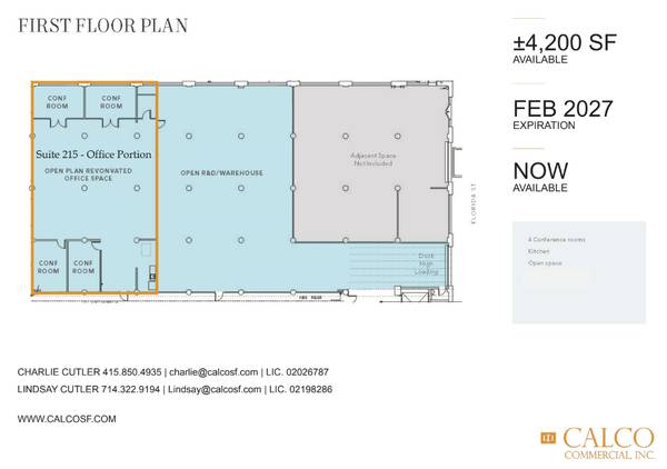 Property Details: • Mission District creative office building with parking • 4 Conference rooms • Kitchen • Open space For more information call: Charlie Cutler BRE 02026787/0203192
