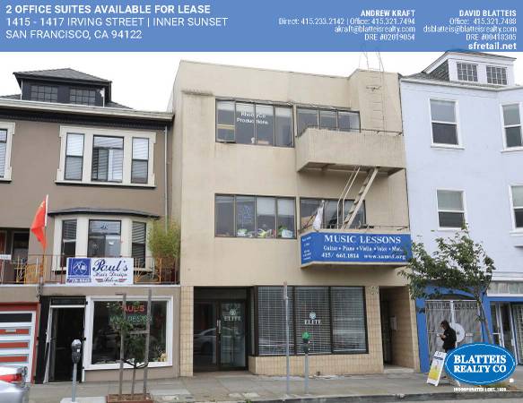Located in the middle of the Inner Sunset, these spaces feature large windows, high ceilings, and is ideal for use as occupational offices. The Inner Sunset is a mix of residential and commercial streets featuring many local restaurants, cafes, and shops. Nearby tenants include IPOT, King of Noodles, Andronico’s, and more!