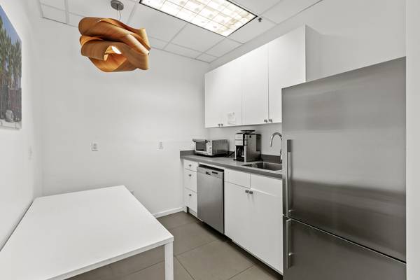 This ±2,056 square foot space includes private offices, a conference room, reception area, kitchen, and two restrooms. The layout currently supports a high number of workstations and offers a modern, bright environment. Floor-to-ceiling windows provide excellent natural light, and the corner frontage offers strong visibility and signage potential along two highly trafficked streets.