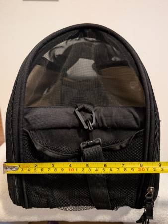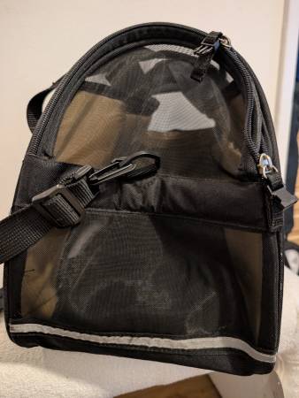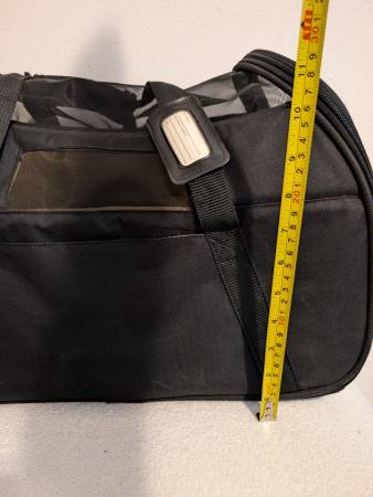 Black pet travel carrier in great conditions, only used twice. Originally purchased from PetSmart. Carry-on size, fits under the seat on an airplane. Comes with removable pad and a long adjustable strap. All zippers work great and has storage compartments. Please see measurements in photos.