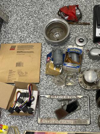 B&M shifter covers, vintage coils, GM seat belts from the 60s', new halogen headlights, flip gas cap, electric fuel pumps, REO NOS 6 pistons, 36 hp VW Bug air cleaner, Empi VW turn signal cover, license plates, 69 Camaro tail lights original, Vintage dog bone radiator cap lighted with temp gauge, heater. sway bar never installed