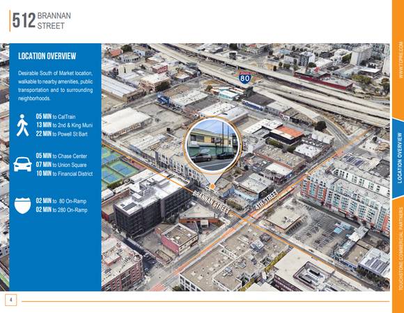 Touchstone Commercial Partners is pleased to offer an opportunity to purchase the fee simple interest in 512 Brannan Street, San Francisco, CA 94107. The approximately 6,000 square foot, single-story structure with partial mezzanine sits on approximately 4,000 square feet of land. Located in the heart of South of Market, this is a rare opportunity to purchase a building in one of San Francisco's most desirable neighborhoods.
