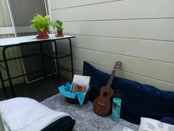 We have 2 spacious, nice rooms located on the main level of the house. The first room has a patio with covered glass skylight, which can be used as extra space for storage or a den. Fresh paint, new carpet, hardwood floor and comes with a desk, a chair, 2 wardrobes, and a twin size bed.