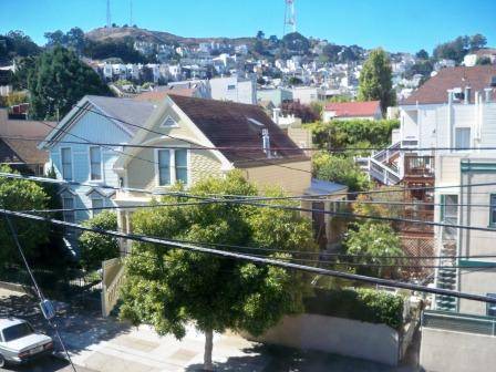 The bedroom has a bay window with a nice view of Twin Peaks. The bedroom fits a queen size bed and a desk.