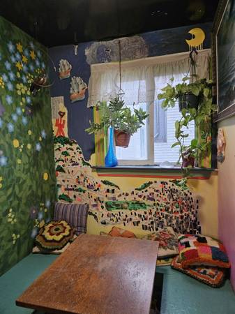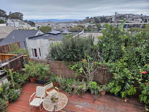 We have a large room in a beautiful 3 story 5 bedroom house in Bernal Heights available! We are a group of friendly creative individuals and have a colorful home full of murals and paintings. The room has a closet and nice window overlooking the backyard and the bay! The shared rooms include a large kitchen and nook, with 2 large pantrys, a big living room, 2 bathrooms with showers and bathtub, an outdoor patio, garden area, garage and laundry room. There are multiple bus lines that are nearby, including the 67, 23, 49, 14 and 23 bus routes. We are located right next to the 101 freeway and the Alemany farmers market. There are multiple very nice parks nearby including holly park and bernal hill. We are also a close walk from cortland avenue, which is full of great shops, including restuaraunts, grocery stores, bakeries, bars, coffee shops and library. If your interested in seeing the space send us an email with your name, number and a little about yourself and we can arrange a time for you to come check it out!