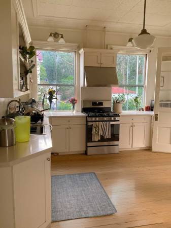 The house is large with many common areas - it has been around since the early 1900's (remodeled this millennium though!). Includes large side yard (with community-minded neighbors) and big porch with views of the bay (it's the best place to drink morning coffee) Loaded with character; antique lighting fixtures, 12 foot ceilings, decorative ceiling work, wood floors, plus convenient in-house washer and dryer. Hardwood floors throughout, lots of natural light, and a big sprawling lawn with professional landscaping.