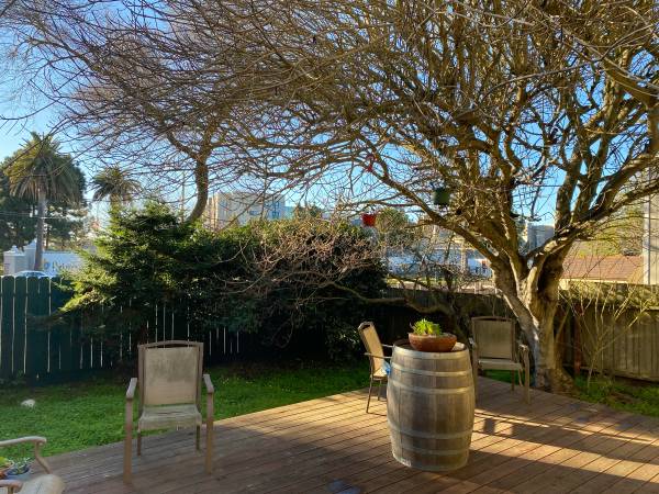 There is plenty of street parking available plus a shared driveway. There is a large backyard and deck.