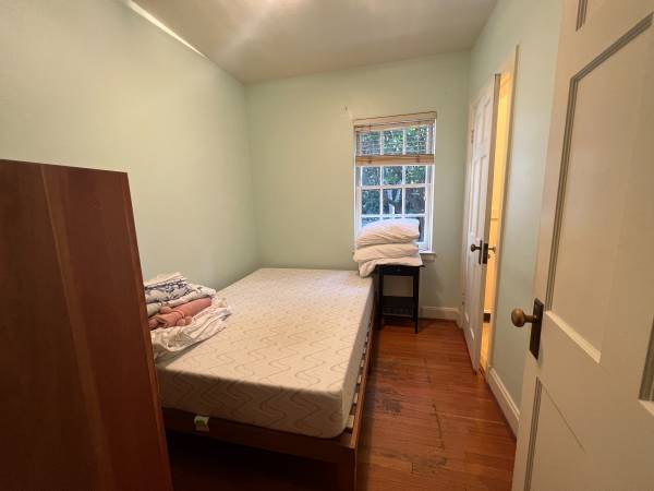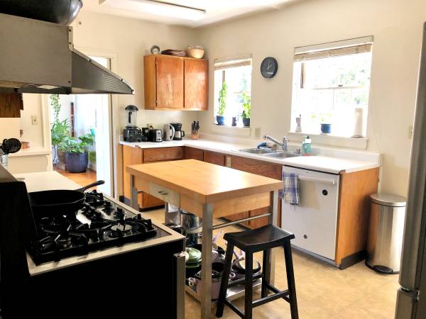 Our home is spacious. We have a large living room, a dining room for entertaining, and a well equipped kitchen with a gas range and oven. A backyard and BBQ make it easy to entertain outdoors too. The available room is fairly small (7' x 9'), but it comes with it's own ensuite bathroom, plenty of closet space, and a view out to the backyard and a eucalyptus forest.