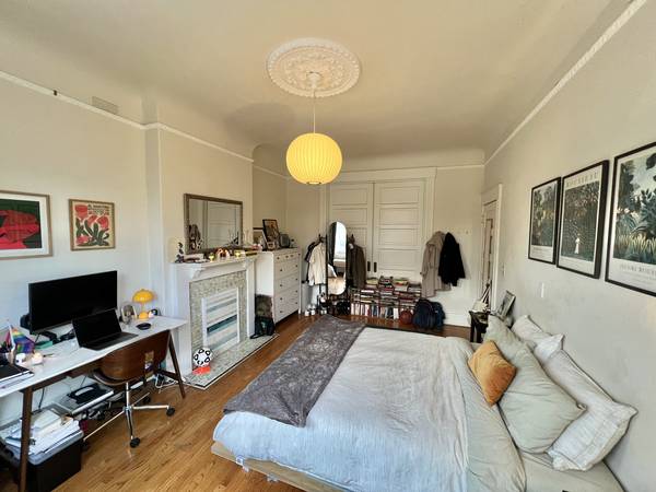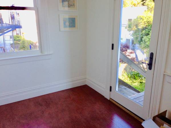 We are on the second floor of a classic SF victorian building. The apartment has high ceilings, wood floors, and a lot of character. The bedroom that is available has one of the bay windows looking out onto Hayes Street. The room is 12' x 15', plus a little extra where the bay window juts out. The room is shown in the first two photos, but is unfurnished.
