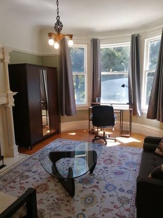 The room is spacious, recently painted, quiet, overlooking the park, includes a full bed with brand new bedding, armoire, dresser, desk with chair, Noguchi style coffee table, loveseat, shelves etc.