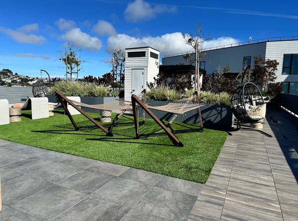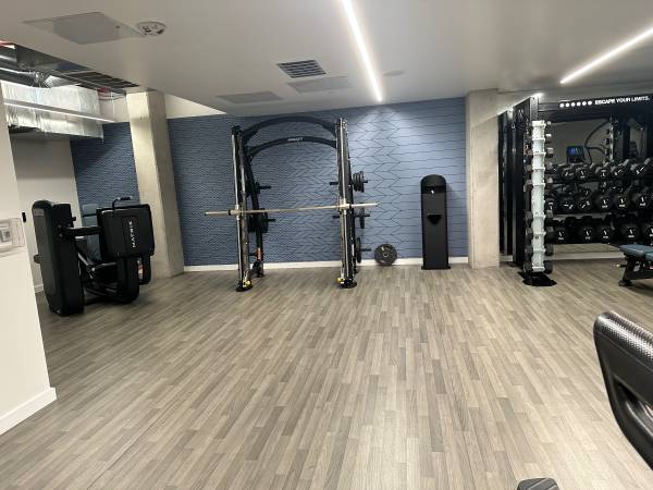 The building has open areas, including conference rooms, a gym, and a rooftop.