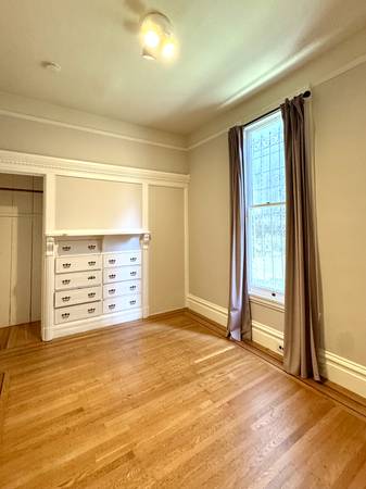 The available room (unfurnished) is the only bedroom on our wonderful main floor. 10ft x 13ft, it opens into the light filled dining room and common space, has a closet and classic Victorian built in dresser and mantle with a North facing window, lovely fresh warm gray paint and hardwood floors. A private spot in the attached garage is also available if needed for an additional monthly fee.