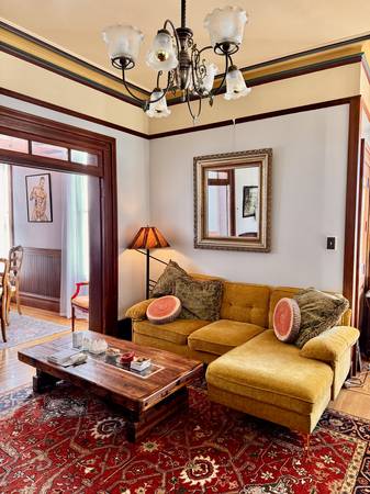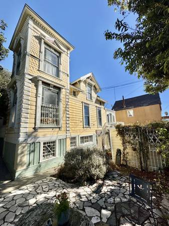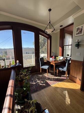 What can we say? It’s a dream! 1894 classic standalone Victorian house, one of the original farmhouses in Bernal Heights. Our space is two floors, 2,100 sq. ft, high ceilinged, and filled with southern light. The main floor has original hardwood with parquet inlay throughout, a large living room, dining room, huge open kitchen with green marble countertops, breakfast nook, balcony with a gas grill, and marbled bathroom. The lower floor has the other two bedrooms, a second bathroom with clawfoot tub, and large storage area with washer/ dryer. Many original Victorian details including stained glass, light fixtures, wainscoting, picture molding, and a lovely porch on the West entrance. The whole house is surrounded by an enclosed outdoor area (we share no walls with neighbors!), perfect for a furry companion. The upper unit is occupied only two weeks a year by the wonderful owner, who lives overseas. Our home is a one-of-a-kind historic oasis that offers privacy, comfort, and convenience.