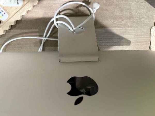 Includes the stand and a bracket mounting mechanism to mount onto a desk. The Thunderbolt cable is slightly frayed. Small ding on glass near the Apple logo.