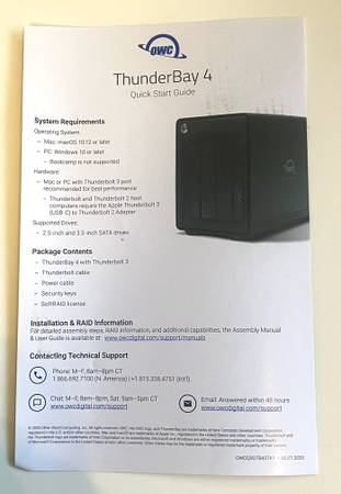 I’m selling an Other Worlds Computing Thunderbay 4 RAID system. It has 4 Seagate Exos Enterprise 4TB hard drives - a total of 16 TB of storage! It can be configured as a RAID (Redundant Array of Independent Disks) or as independent drives.