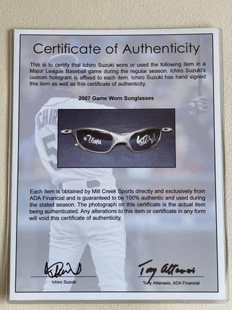 I am offering 2007 Ichiro Mariners sunglasses, autographed and authenticated, with a certificate of authenticity.