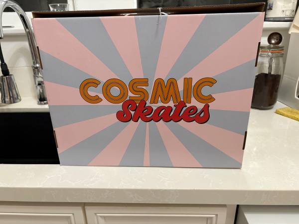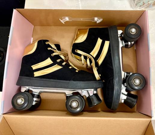 New! Unisex rollerskates Black and gold Sneaker Roller Skates-Faux leather Brand:Cosmic Skates Upper Metal speed lace eyelets. Aluminum alloy trucks. Aluminum alloy plate. 58mm 82A durometer...