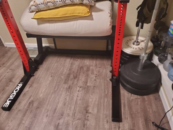 Rouge monster lite rack with flat bench. Includes Barbell and 300lbs of bumper plates. Plate holder and barbell holder attachments. Curl bar included. Everything is like new condition.