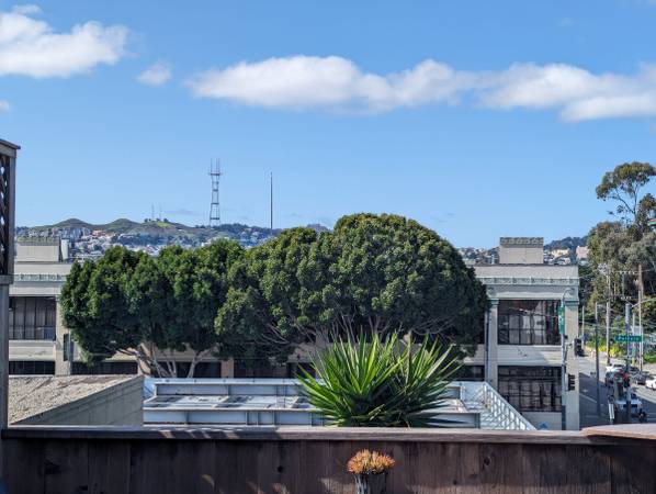 There is a large sunny deck upstairs you are welcome to use, to enjoy the view West, towards the sunset, over Twin Peaks.