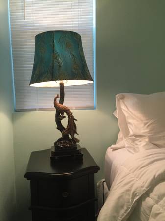 BEDROOM & HUGE WALK-IN CLOSET: One bedroom with queen bed, nightstand, peacock lamp, gorgeous antique vanity, tall dresser, and huge 10 foot walk-in closet.