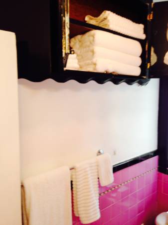 ART DECO BATHROOM: Art Deco bathroom has original purple and black tiles, custom built cabinetry, big soaking bathtub, shower, and vanity.